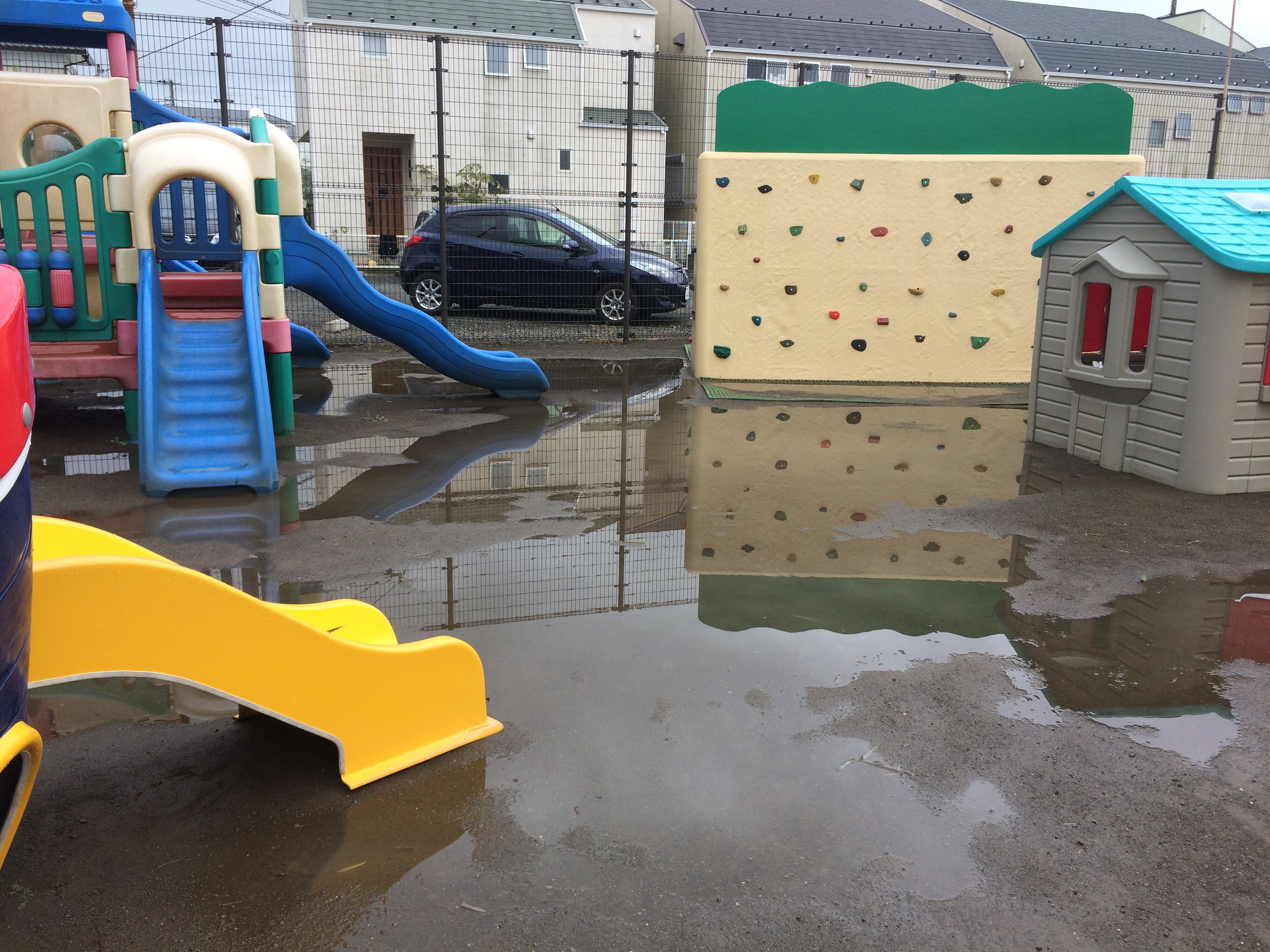 | 昨日の大雨のため園庭遊具周辺の水が引きません。 掻き出す以上の量ですので 本日の園庭開放はスペースを制限したく ご了承のほどお願いします。 なお、雨天の場合は中止します。