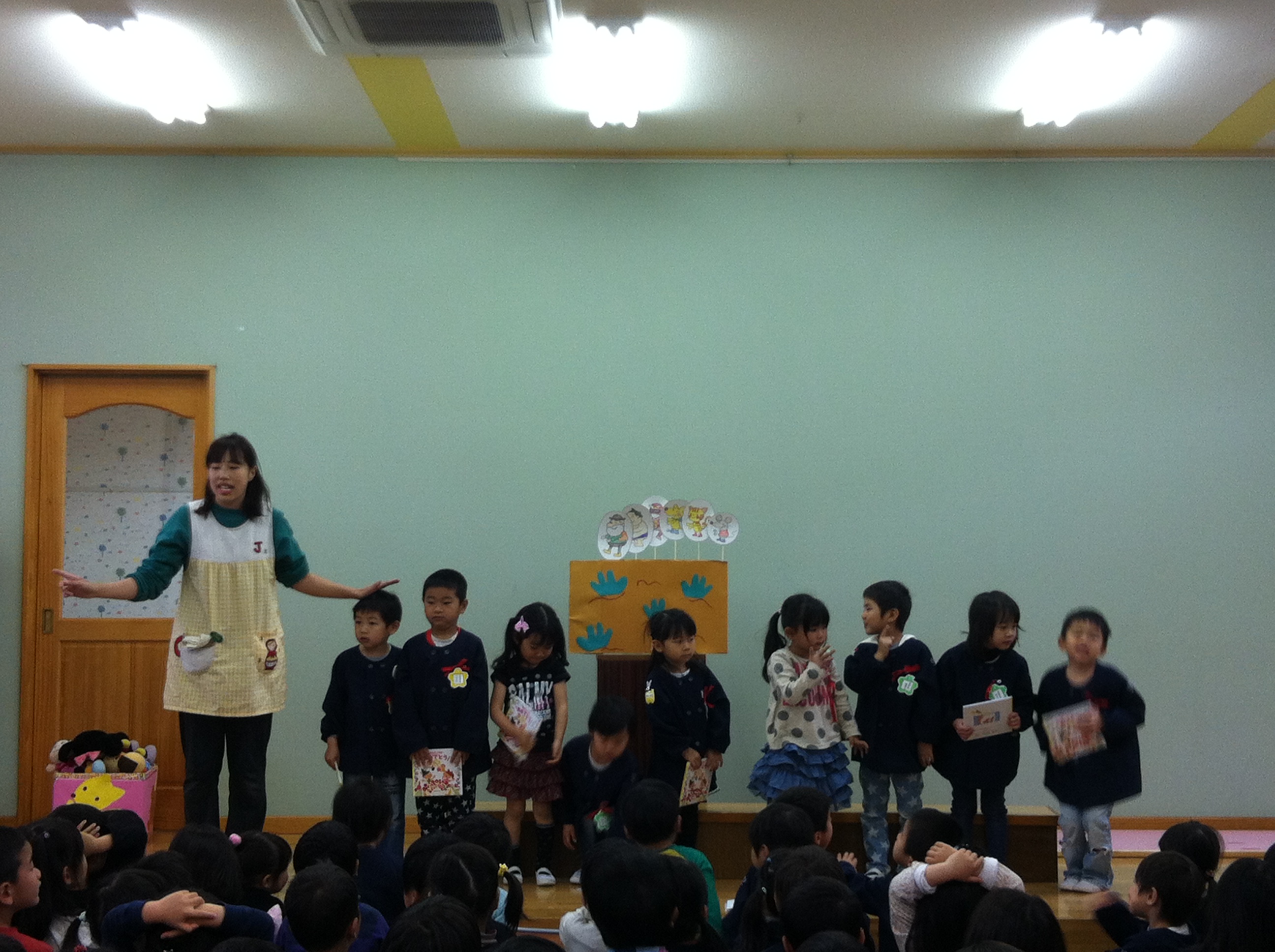 | 西村先生や朋子先生と一緒に 声をそろえて… 「これから、たいそうきょうしつをはじめます。