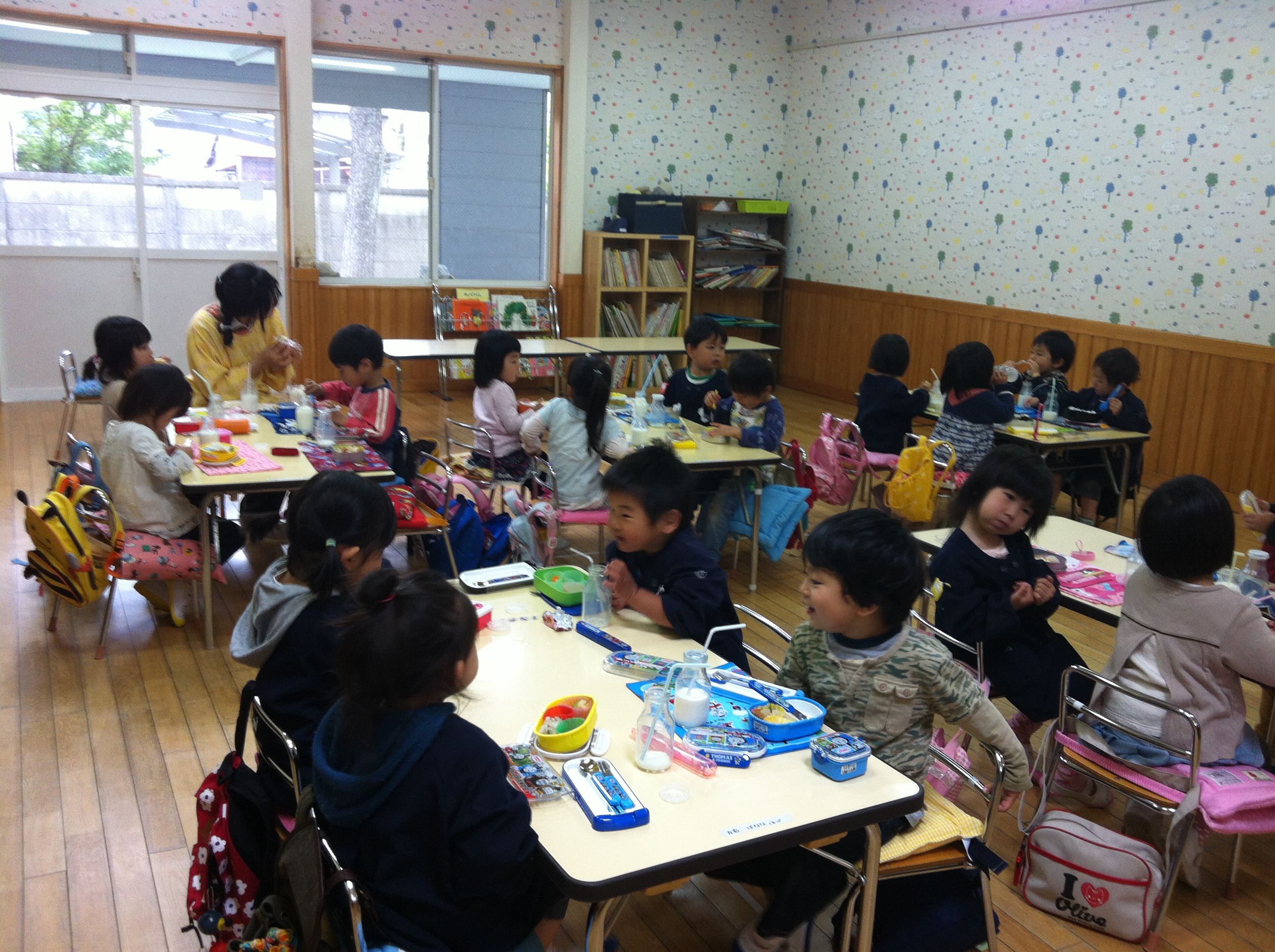 そして、園児は「ごちそうさま」の給食を おうちの方はご家庭からのお弁当を テラスや遊戯室でいただきました。