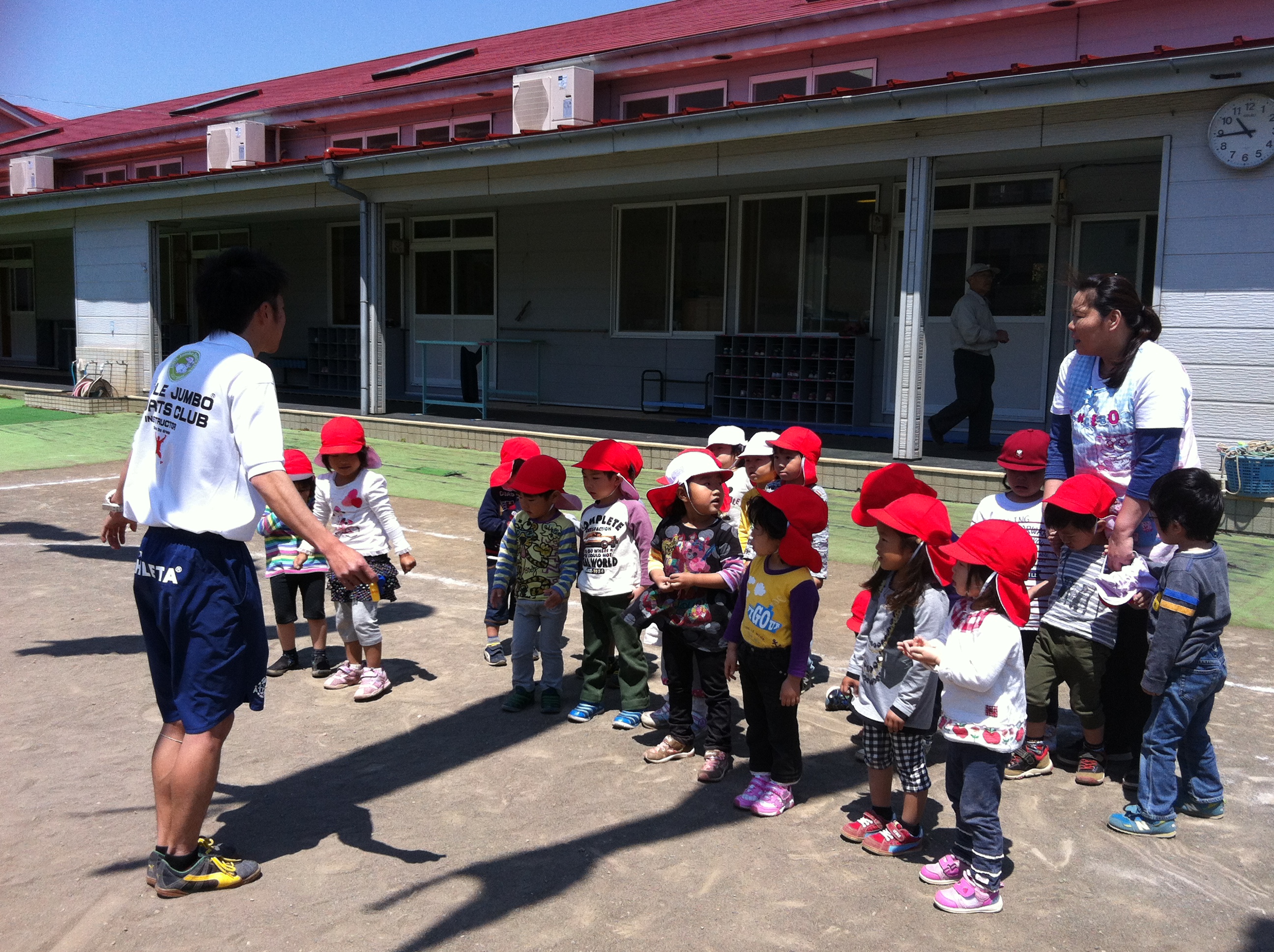 | 登園後の自由遊びの時間の次は お部屋に戻る前に 全員で園庭でピーターパン体操をしました。 今日は初めての体操だったので 園児達は先生のお手本を見ながら 首を回したり、上体を横に倒したり 片足で立ってバランス〜