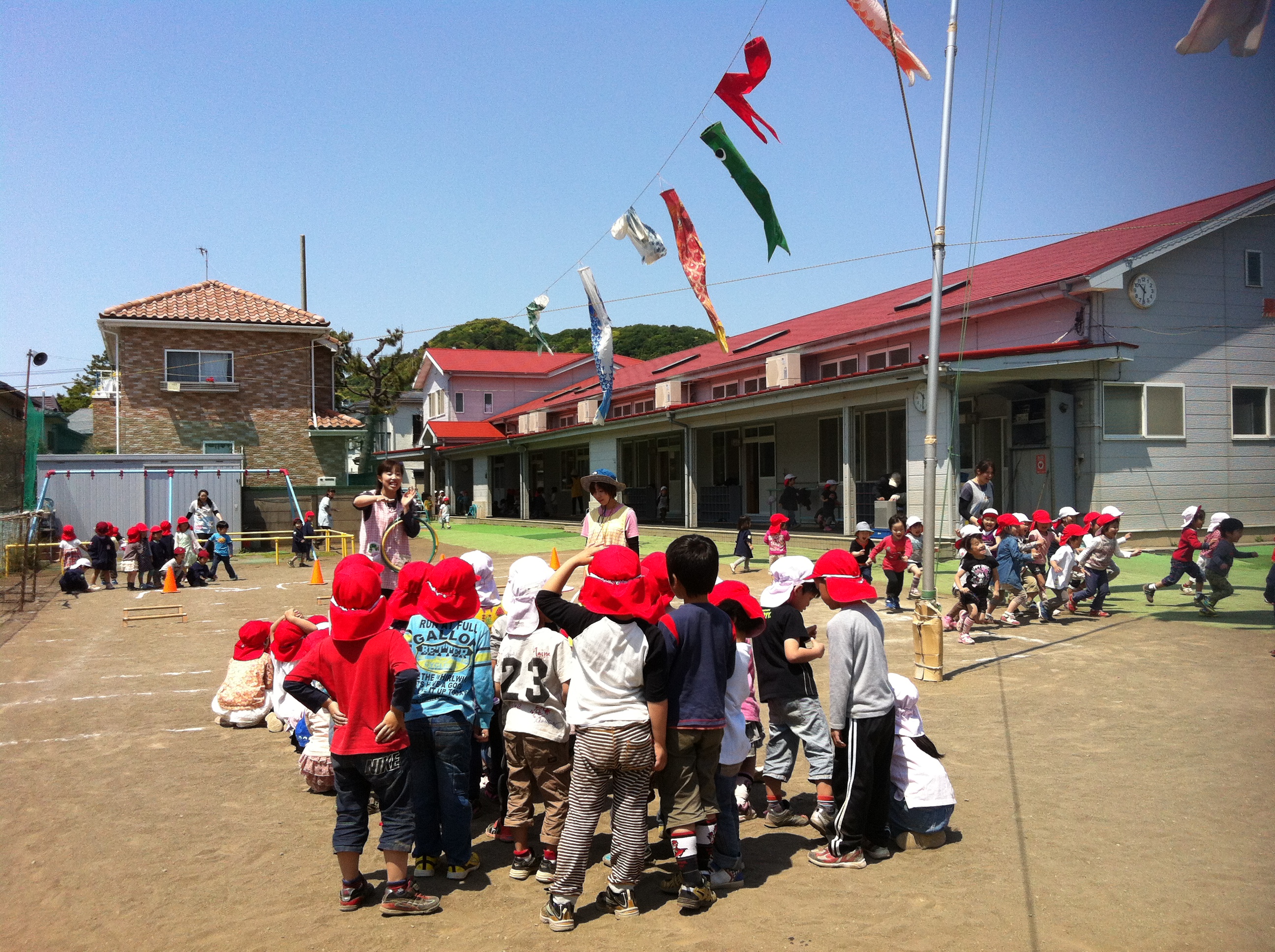 体操の後はクラス毎に園庭のあちこちで 思い切り走り、笑顔でいっぱいでした。