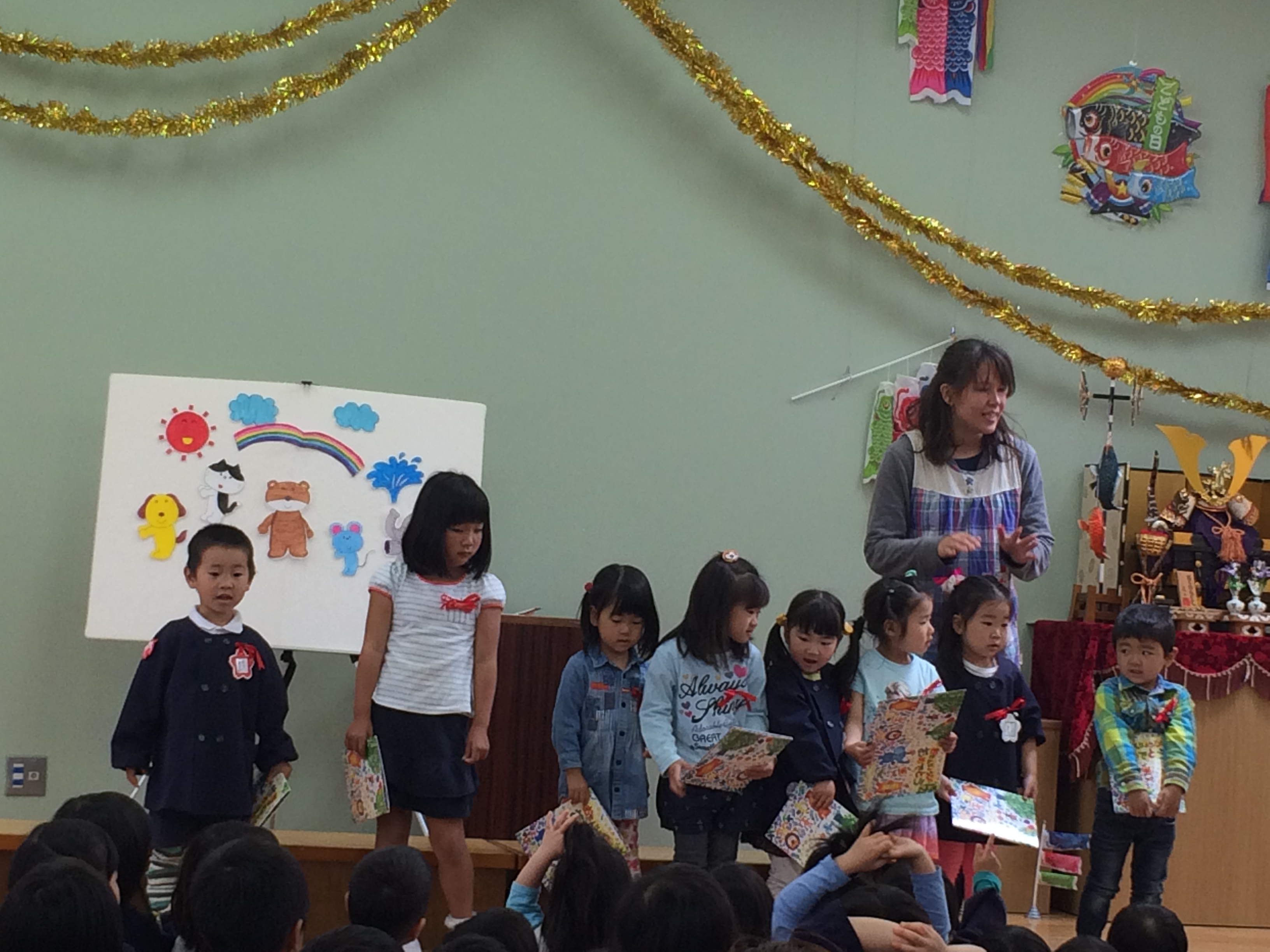 司会のナターシャ先生からのプレゼントは 穴に落ちたクマさんを いろいろな動物が協力し 皆のうんとこしょ、どっこいしょ の 掛け声も手伝って やっと穴から引っ張り上げるお話でした。