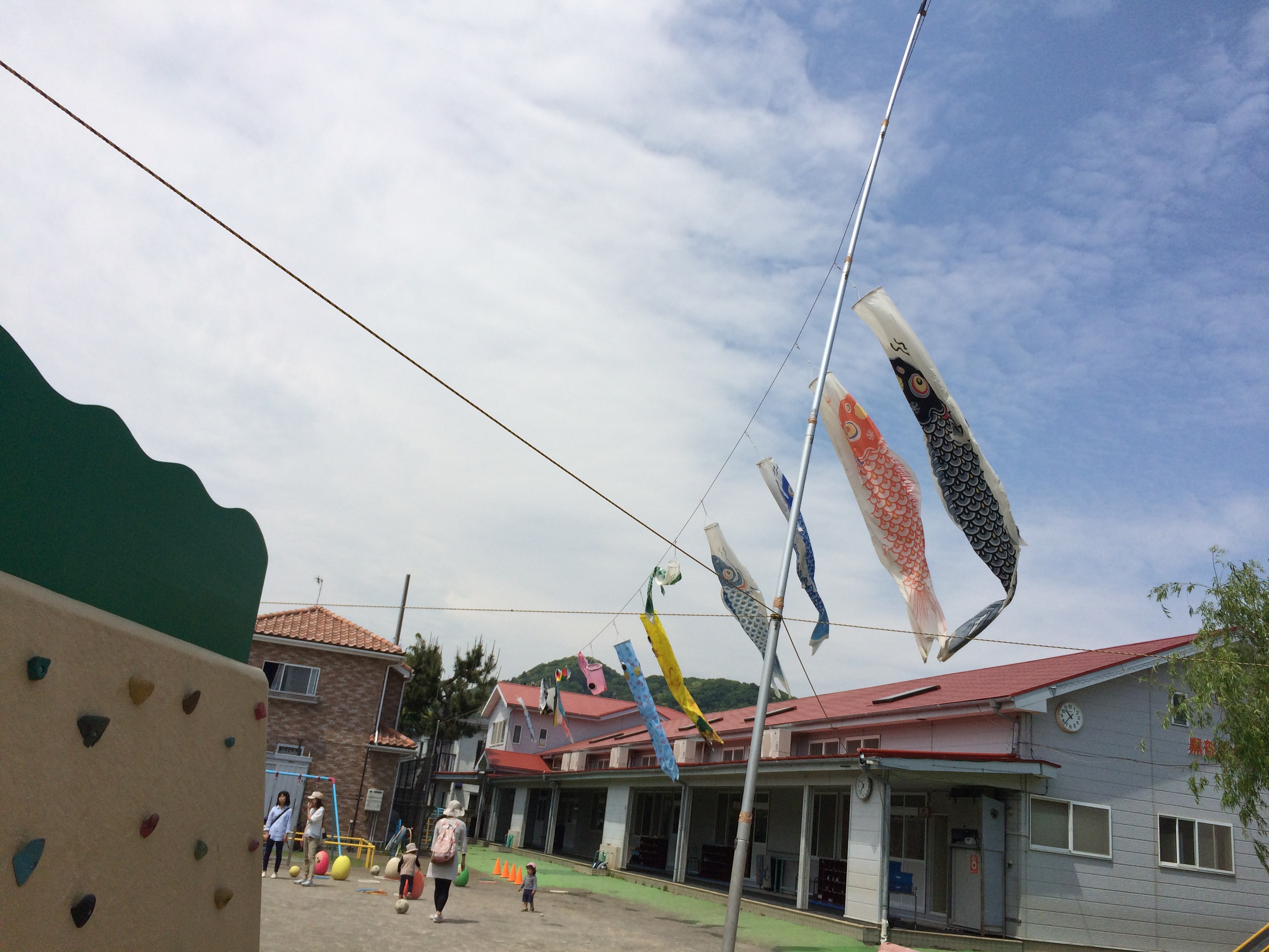 | 園児の手形/足型形を うろこに見立てた オリジナルこいのぼりも一緒に すがすがしい空を泳ぐ下 小さいお友だちが園庭で遊んでいます。