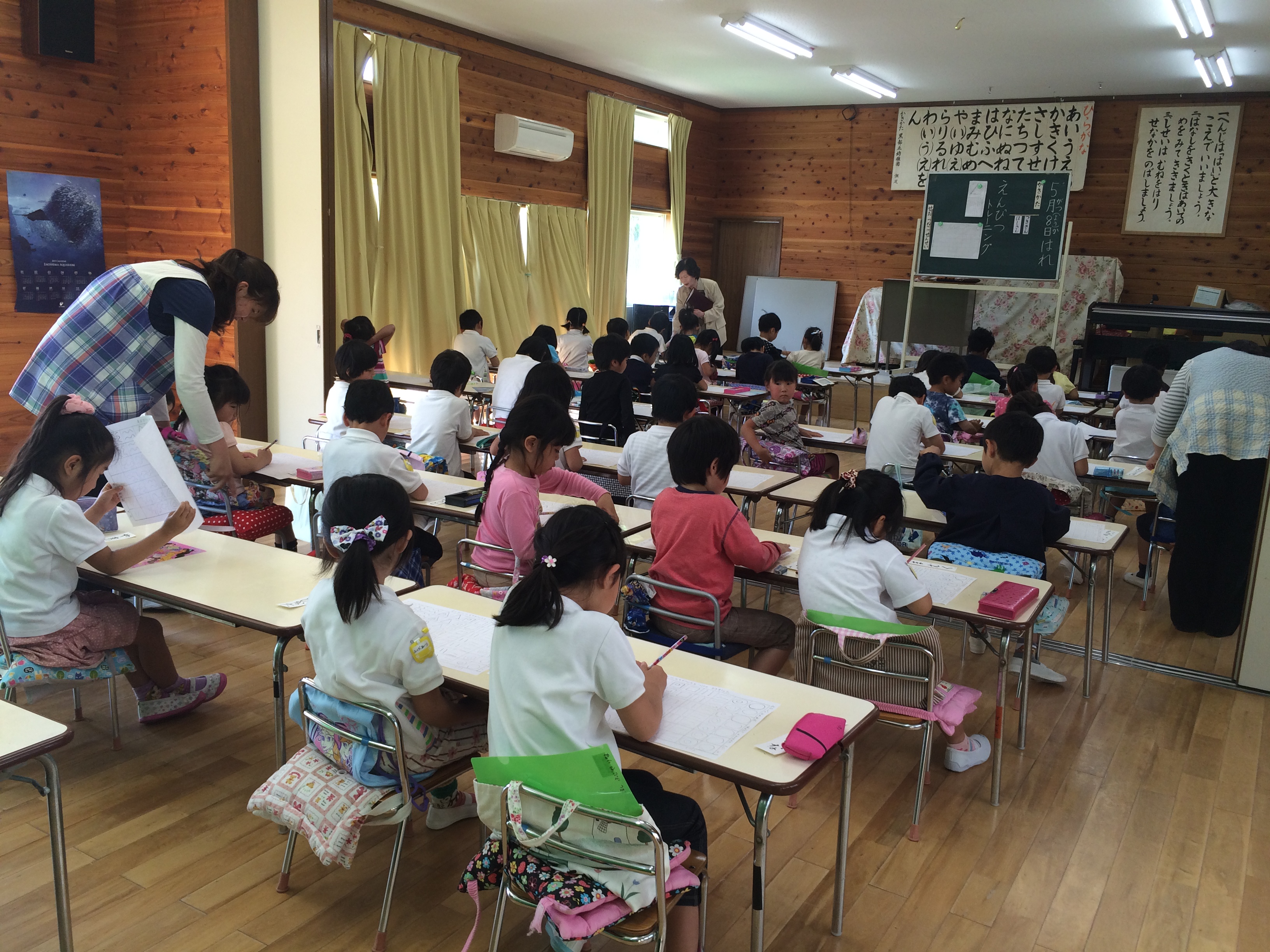 いつも元気いっぱいの黒部っ子も この時間は別人! 瀬尾先生ワールドで 静かに楽しくお勉強です。 時々、年中さんが憧れのまなざしで 廊下からのぞいています。