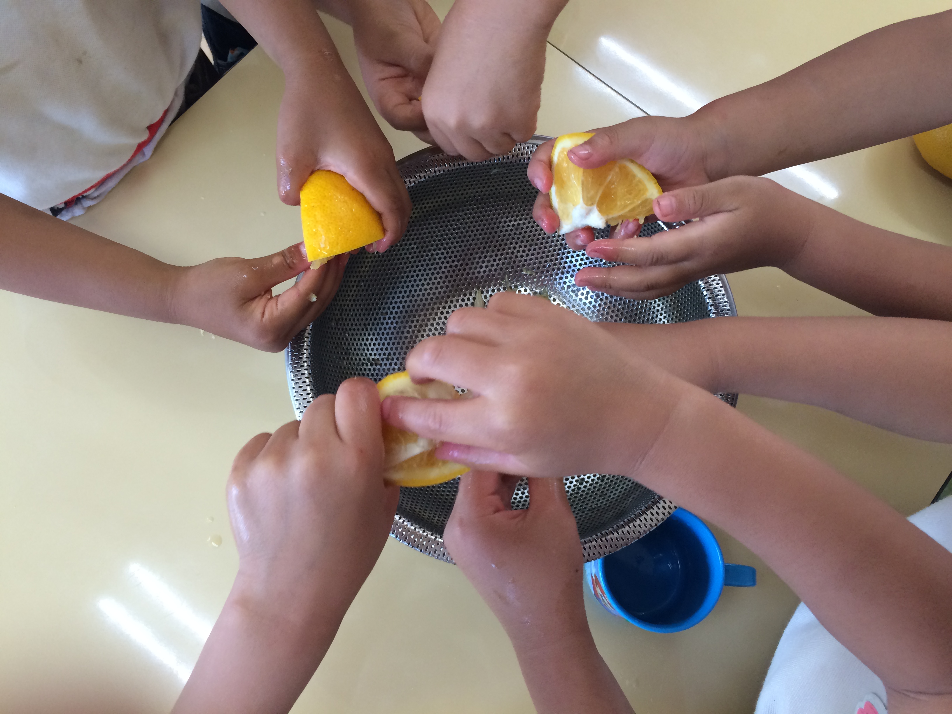 | 預かり保育「たけのこ」で 今日は園長先生の庭から取ってきた夏みかんを 皆で手絞りしてジュースを作りました。