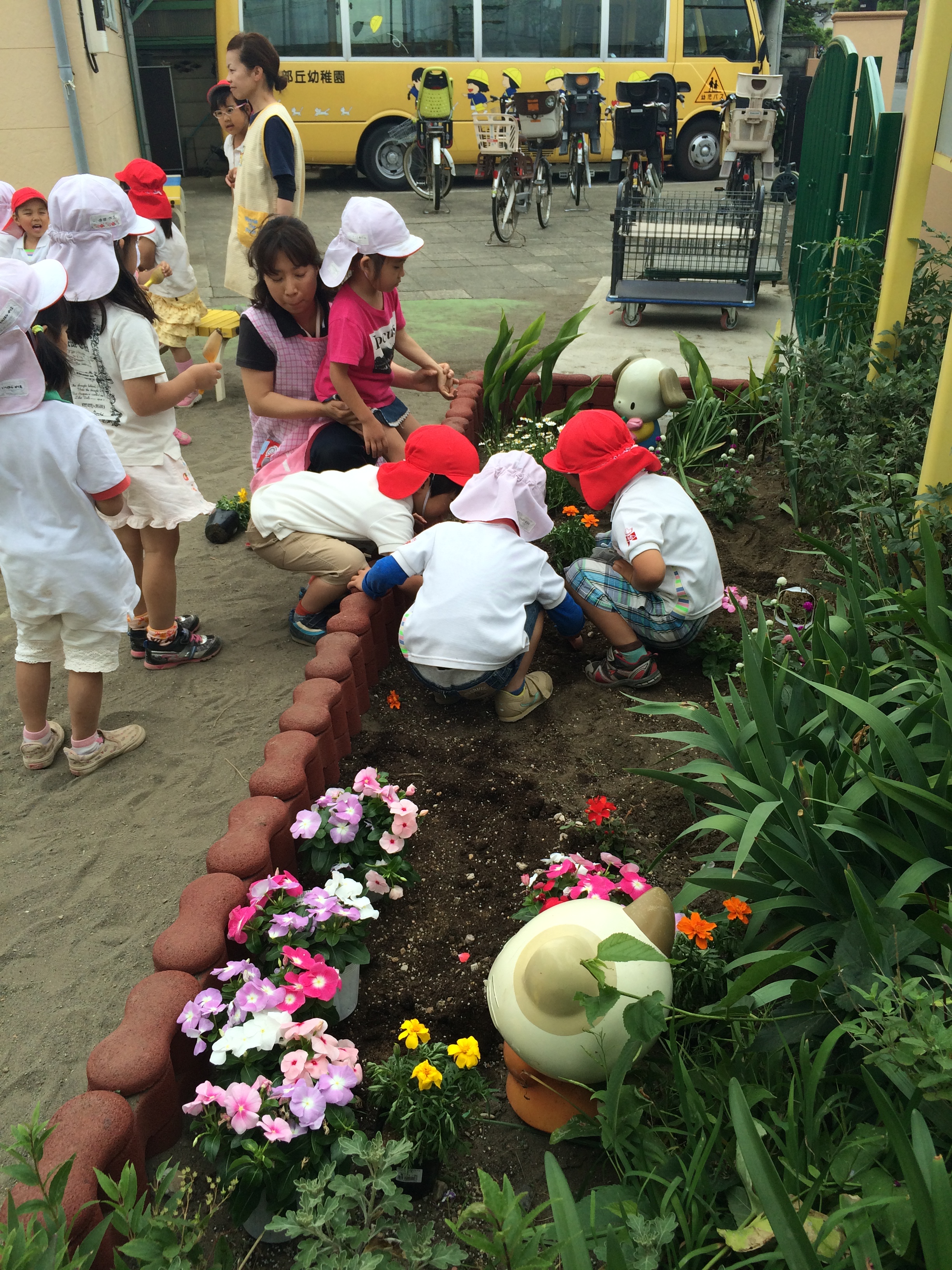 | 年中すみれ組のお友だちが千恵先生から お花の名前を教えてもらいながら 順番に苗を植えています。 これからの季節、だんだん大きくなって たくさんお花が咲きますように。