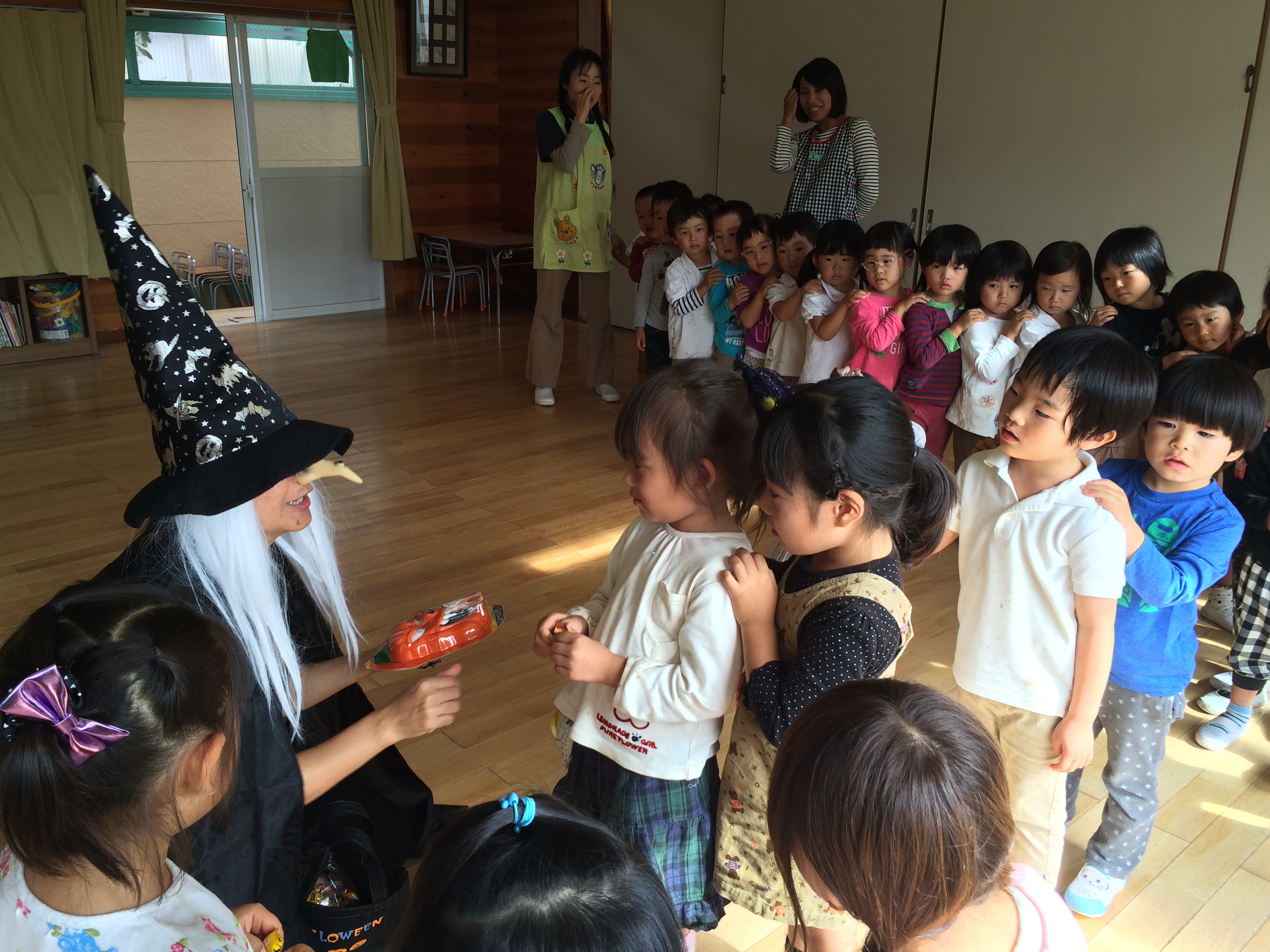 挨拶やお天気、曜日の歌の後で 「ミイラママはどこ?」のストーリータイム 骸骨ダンスをポキポキ踊り 最後に魔女から チョコボールを手渡されて 上目使いに恐る恐る受け取る人も いました!