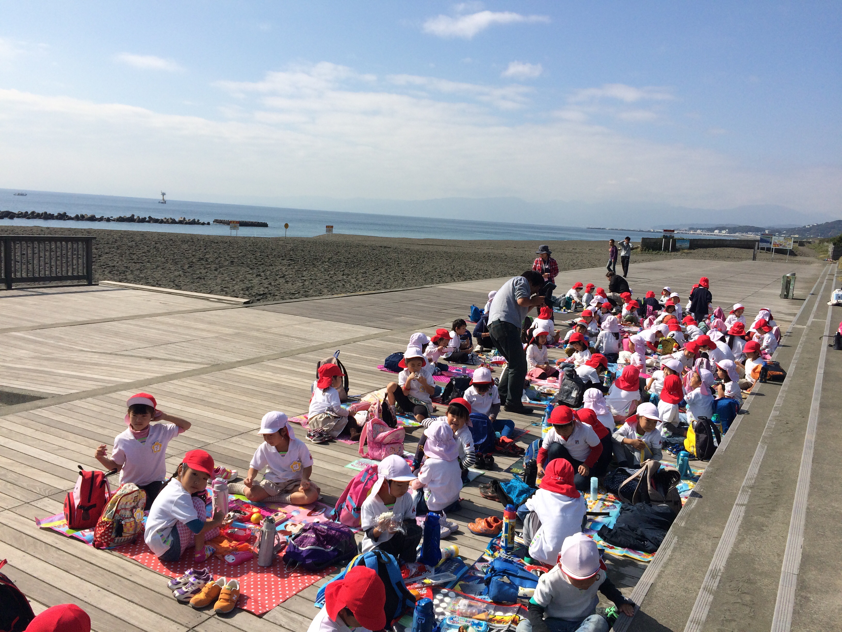 ぽかぽか陽気の秋の日に 園児たちと教員が 桃浜公園からひらつかビーチパークを 目指しました。