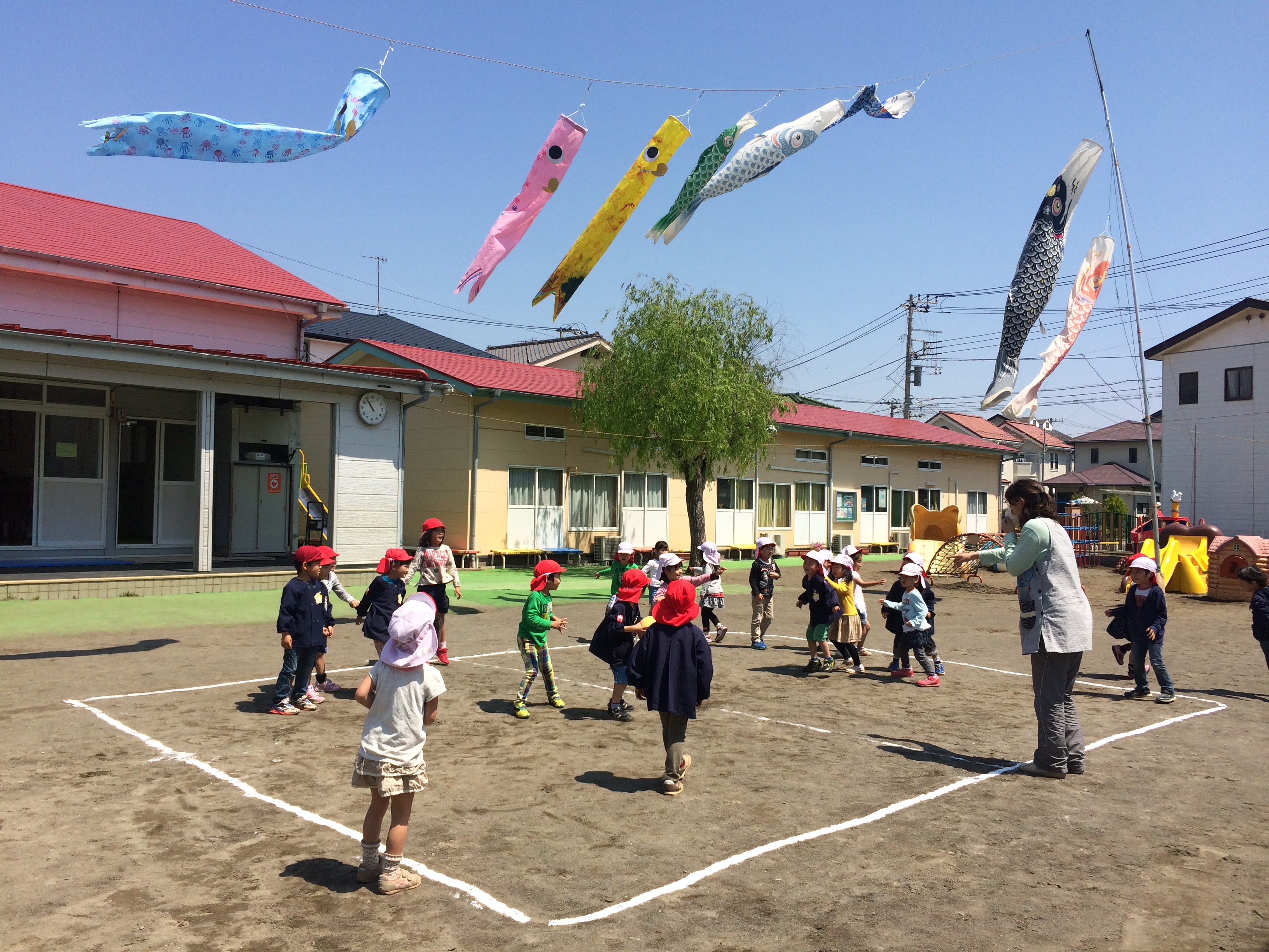 | 園児の手型・足型でうろこ模様を作った こいのぼりが青空を泳ぐ下 年長クラスは元気にドッヂボールで 走り回っています。