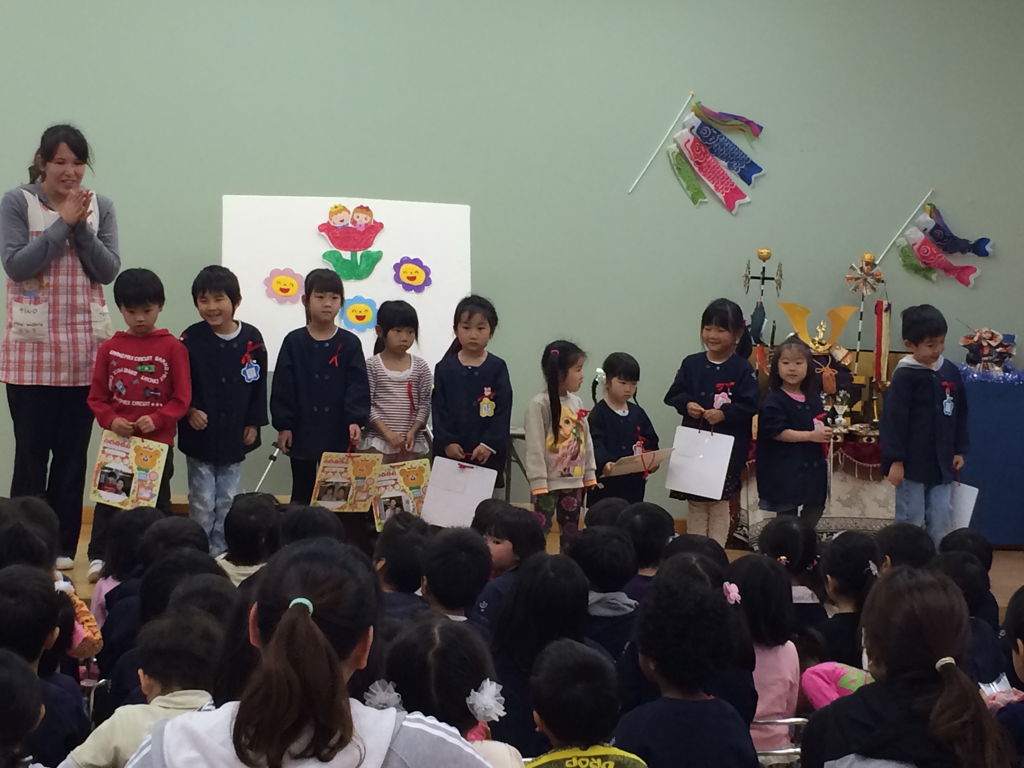 | 誕生月のお友だちは 一人ずつ ステージにあがり 名前を言って そして司会の先生からのインタビューに答えます。 お誕生色紙を受け取って嬉しそう!