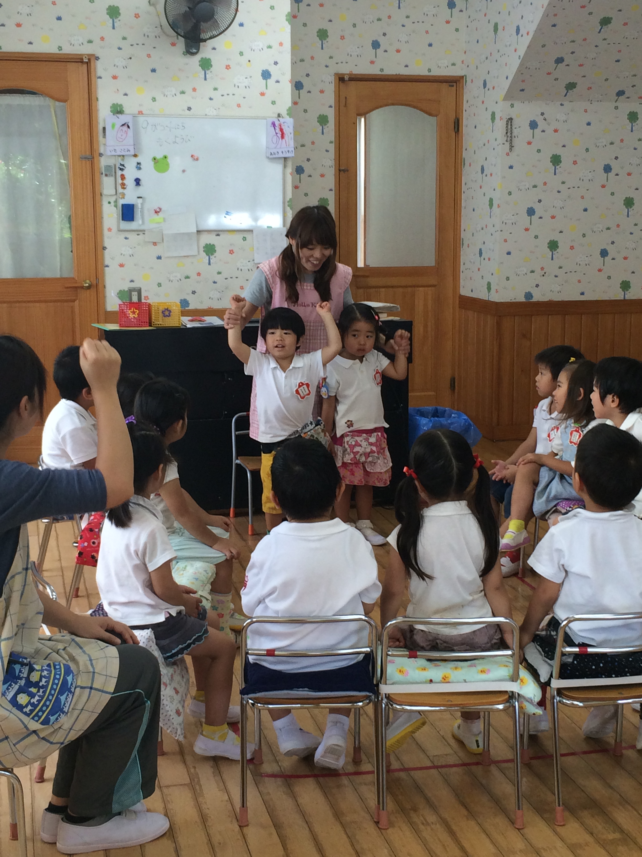 | 年少組でも2学期から各クラスで順番に「お当番」が始まりました。 朝の会集で「お当番さん、お願いします。」「はい、がんばります。」と ご挨拶をして、お当番さんはちょっと誇らしげです。 お弁当の前に机を拭いたり、先生の配り物のお手伝い、 牛乳の注文用紙を届けたり…大活躍の一日です!