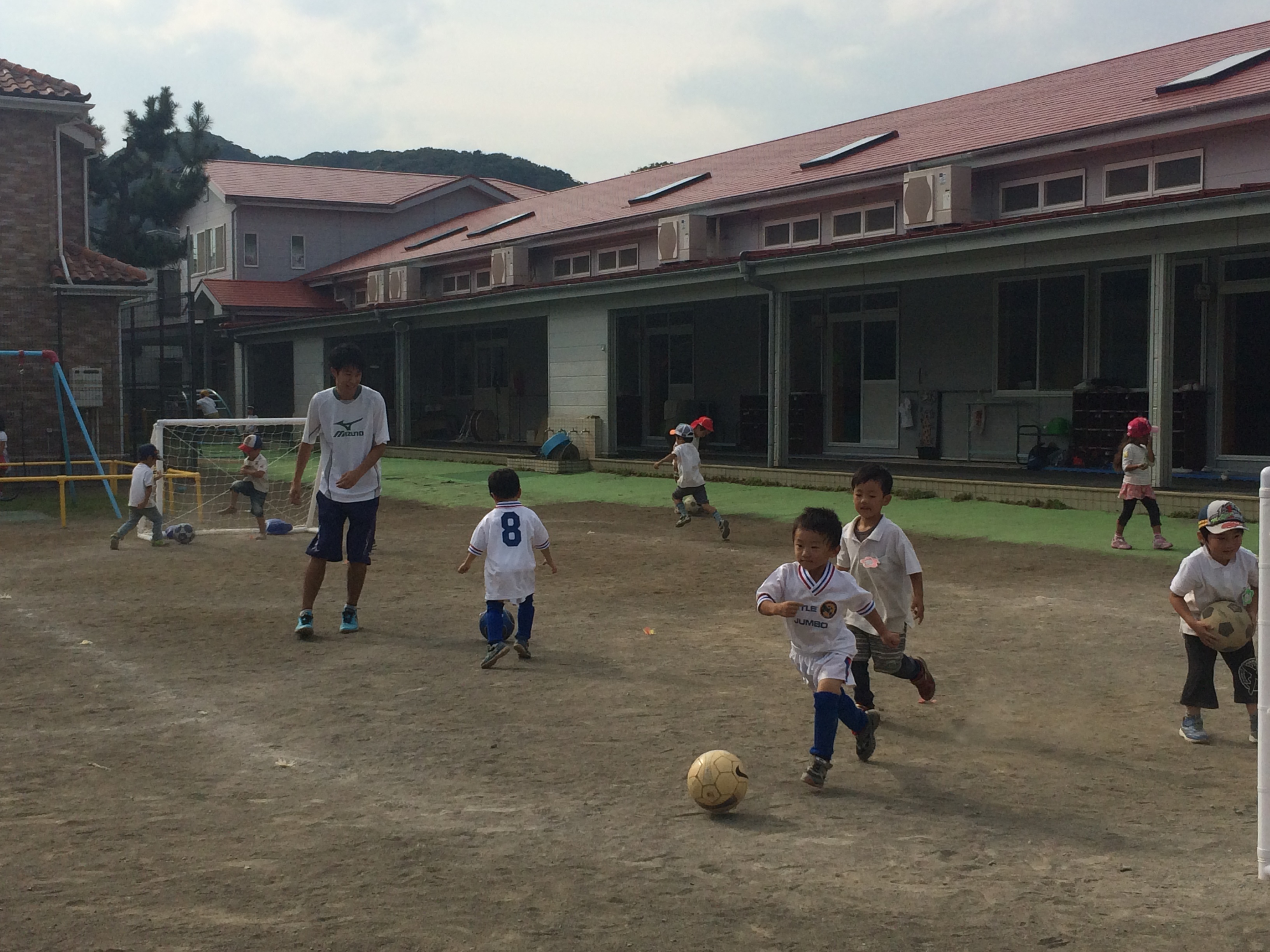 始まる前には クラブに入っていない園児もボールを追いかけ コーチの岩渕先生と一緒に 園庭を走り回っています。