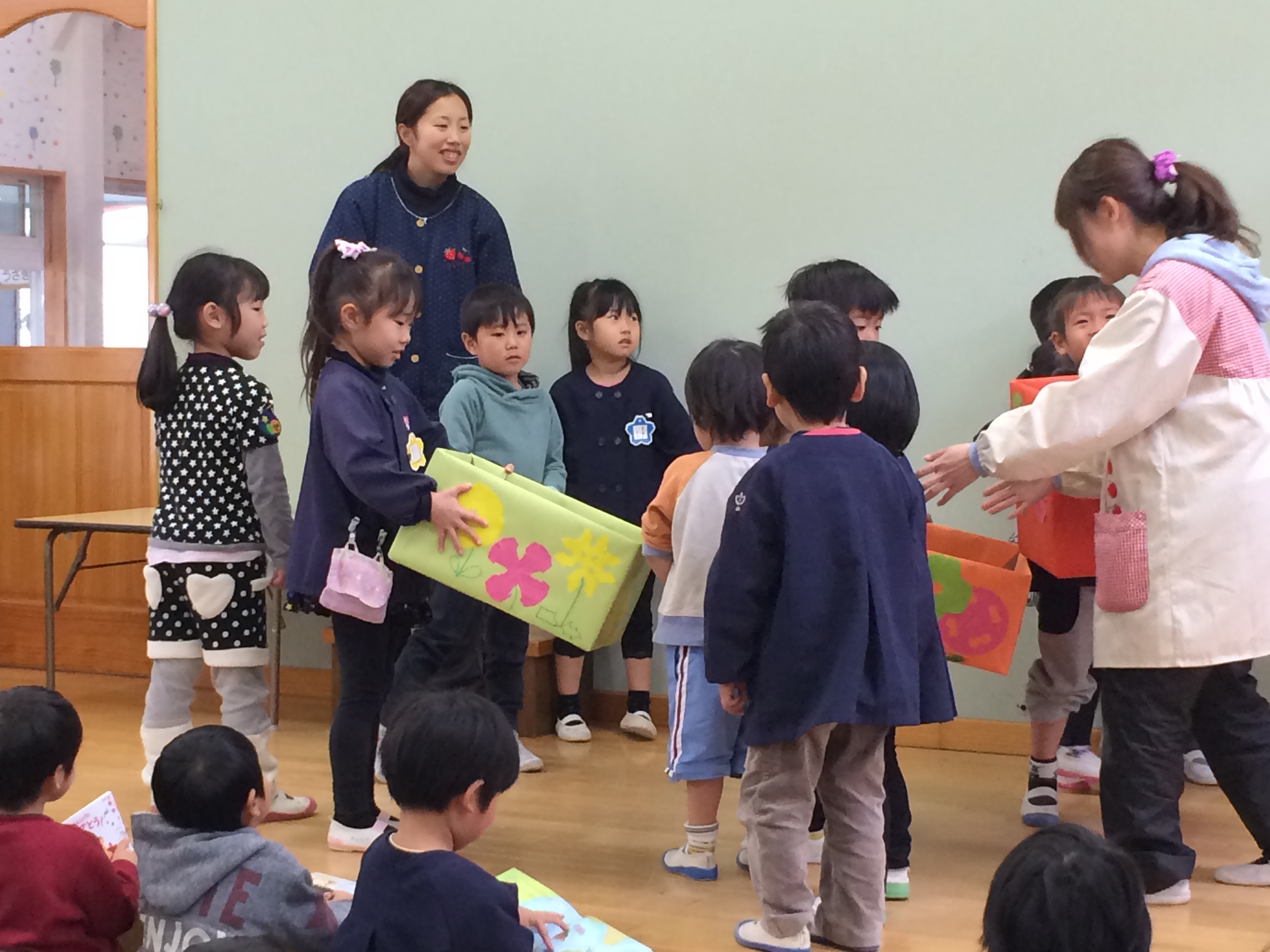| 年中さんから手作りのライオンメダル 年長さんからはお部屋で使う おもちゃ箱
