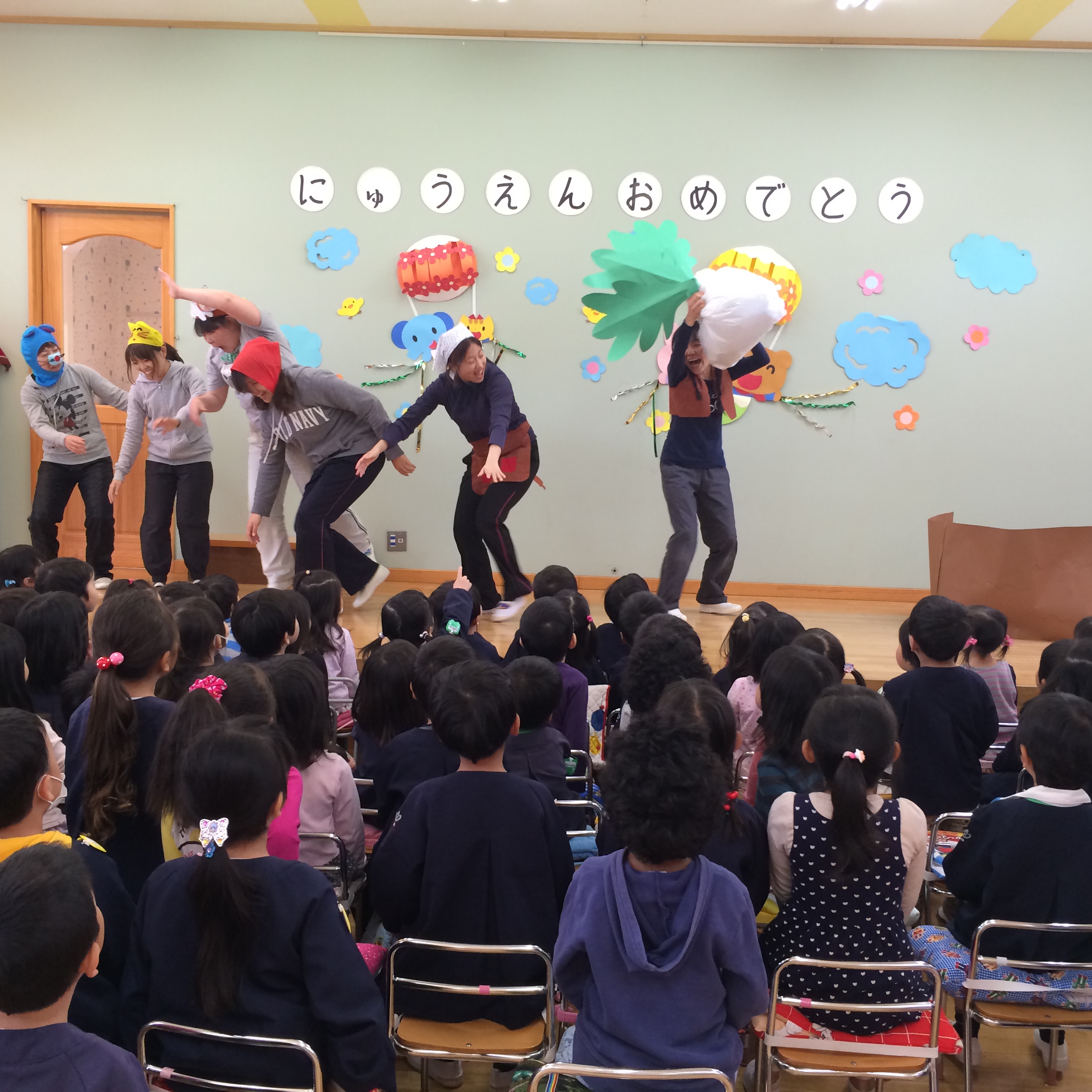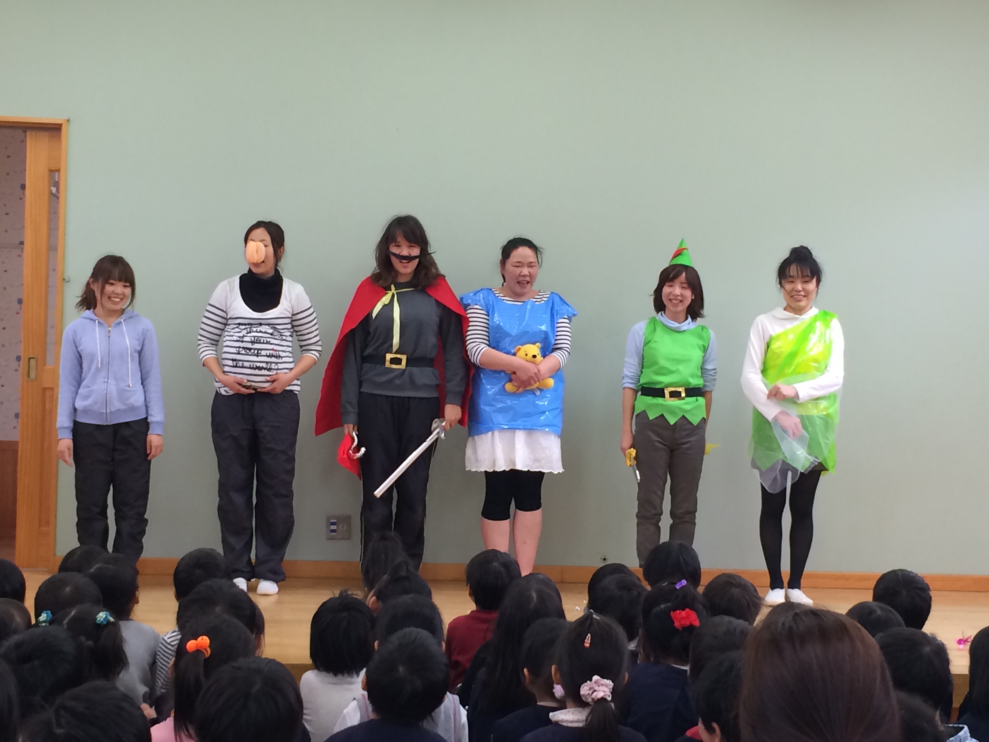 | 初めて全園児がステージのお部屋に集まりました。 お祝いの劇は先生方による 「おおきなかぶ」 「うんとこしょ どっこいしょ」の皆のかけ声で・・・ ほら、やっと 大きなかぶは ぬけました!