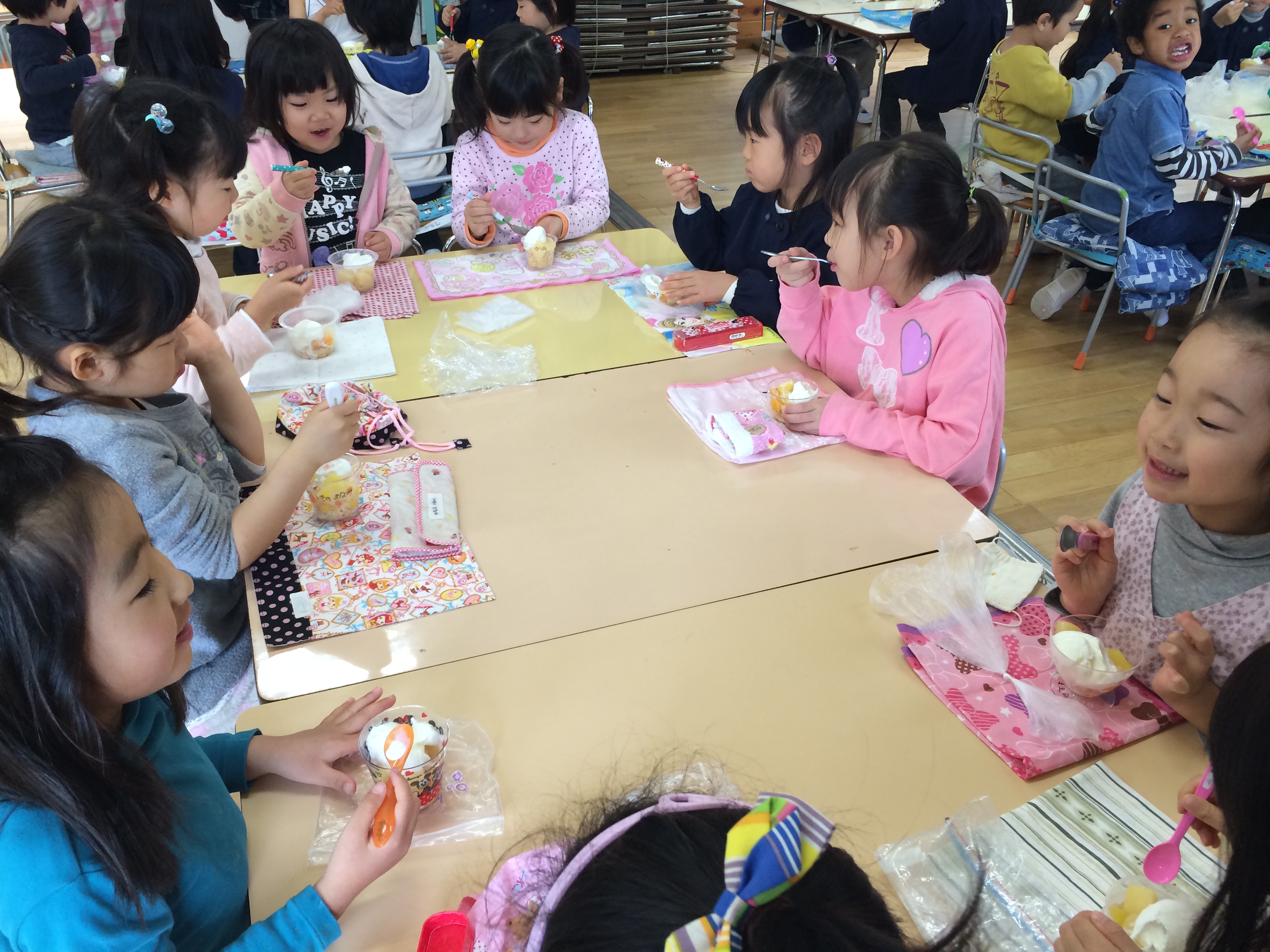 年中さんは、ゆうぎ室に集まって みかん、桃、パイナップル、玄米フレークに アイスクリームを た〜っぷりのせて