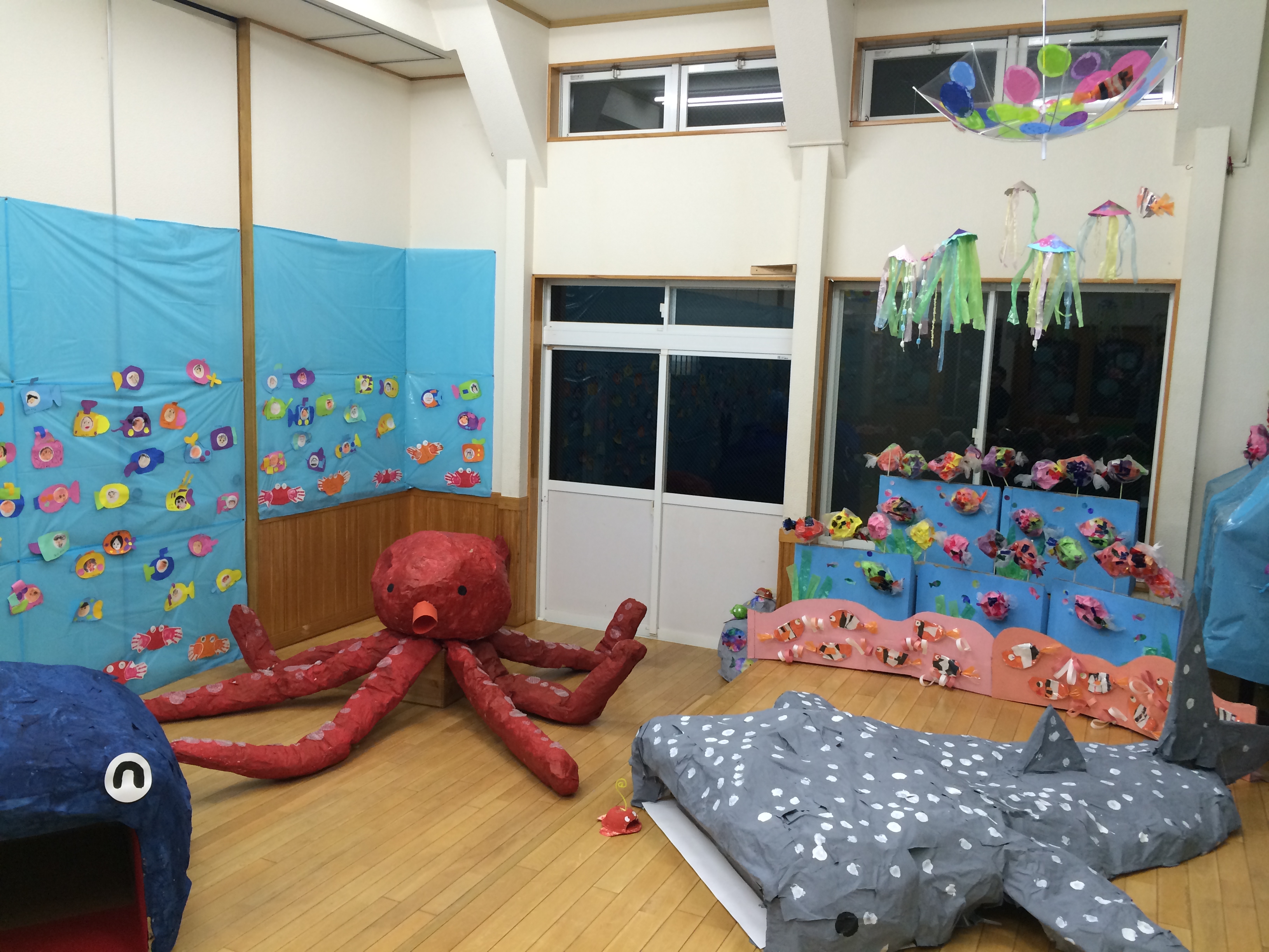 | テーマ 「 海 の 中 」 クジラや潜水艦、大ダコやジンベエザメもいます。 皆で力を合わせて頑張った一か月 4月からの個人製作は一人ひとりの成長が見られました。