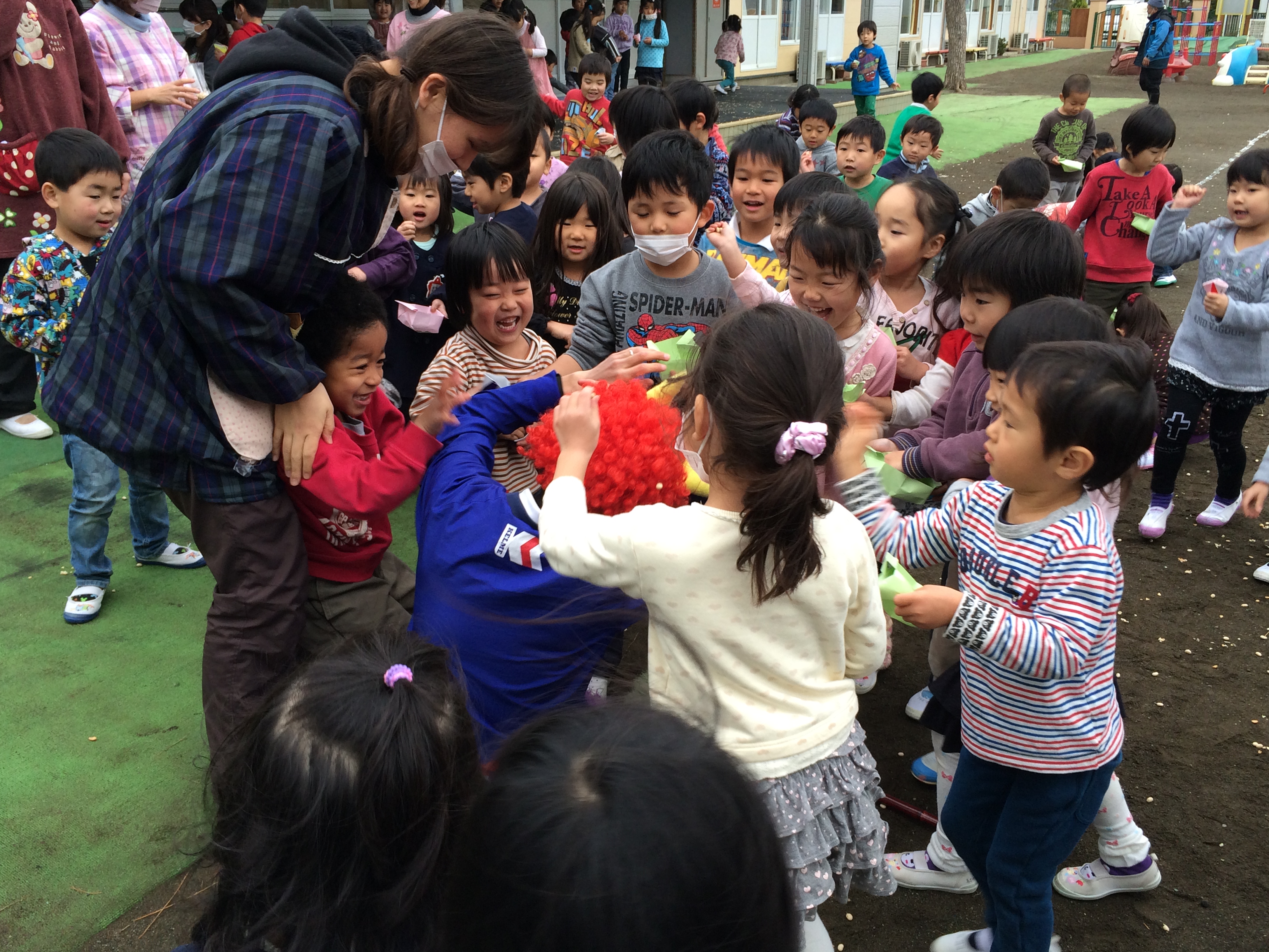 | 今年の鬼さんは元気いっぱい! 子ども達の歓声の中 園庭中を駆け回り… ついに皆に囲まれて豆を投げつけられ降参です。