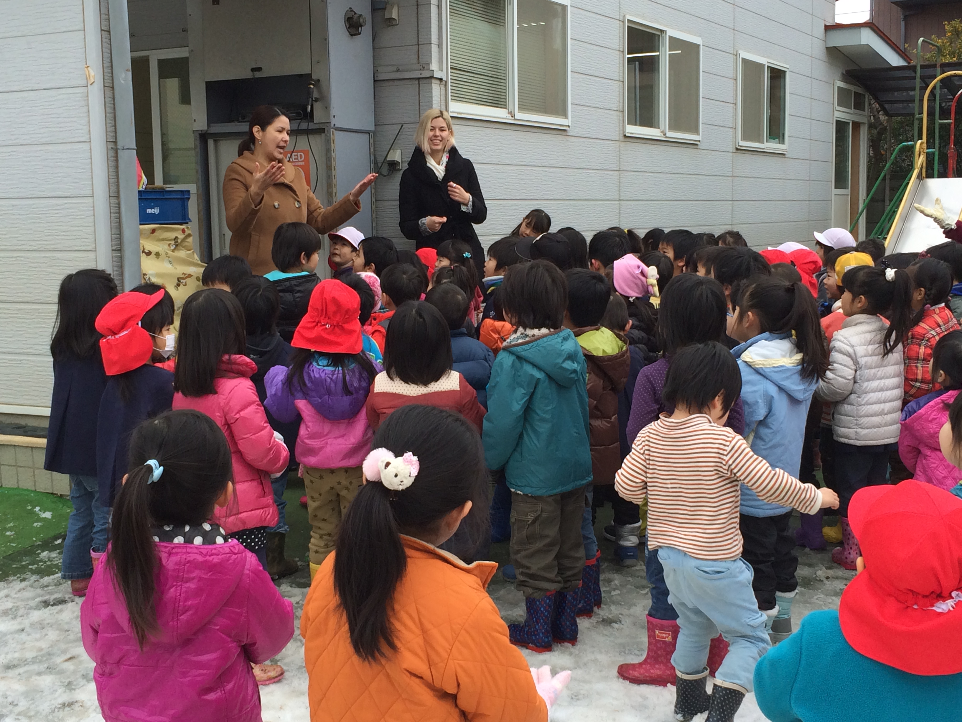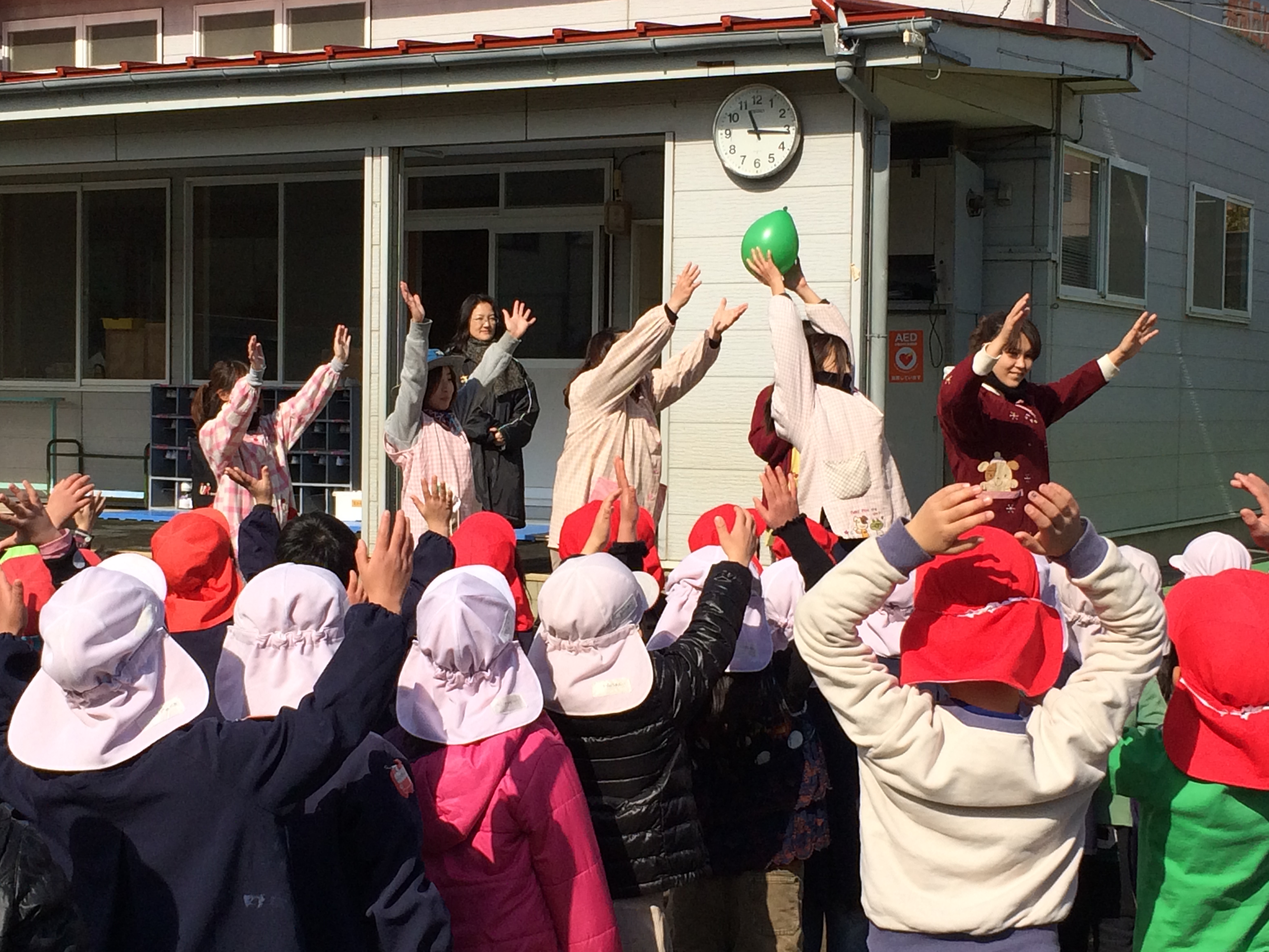| 桜ヶ丘公園へピクニックを予定していましたが 前日の大雪のため、園庭で全員で3つゲームをしました。