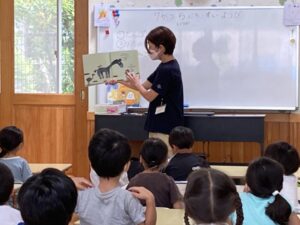 普段は担任が読む絵本ですが、いろいろな大人に読んでもらう絵本の世界に、子どもたちは一瞬で引き込まれます。ご家庭でも、今がチャンス!夏休みは親子で是非是非、絵本の時間を楽しんでください。その時間は大人になっても忘れない、一生の宝物になります(60年以上経った園長の保証付きです)。