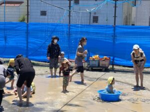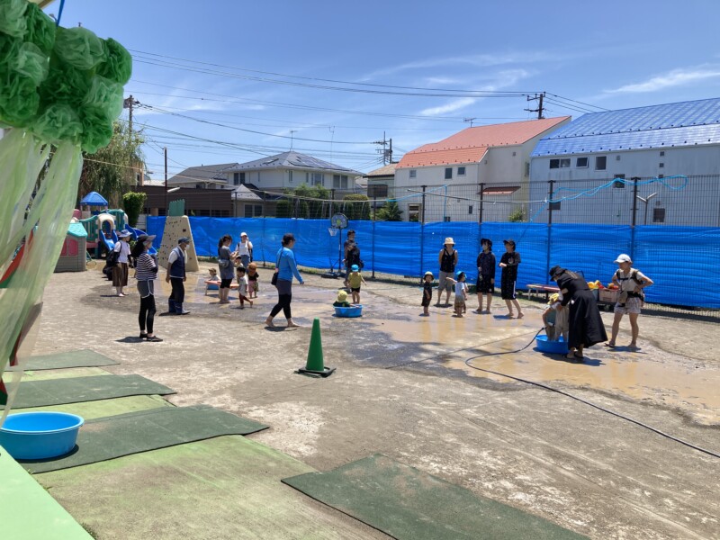 ☘りす組☘ 7月のりす組の様子です。黄緑色のTシャツはJojo先生、みんな楽しそうにフルーツのカードで遊んでいますね。ピンクのエプロンは有紀先生で、この日はカタツムリを作りましたよ。水遊び泥んこ遊びもしました。体操の山口先生はジャングルジムの方にいますが、小さ過ぎてよく見えませんでした…(^0^;) 9月の最初のりす組は、みんなで奥の園舎に探検に行きまーす。年少のことり組ものぞいてみようっと!