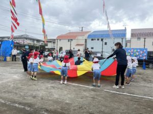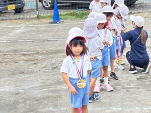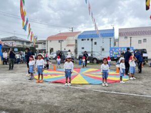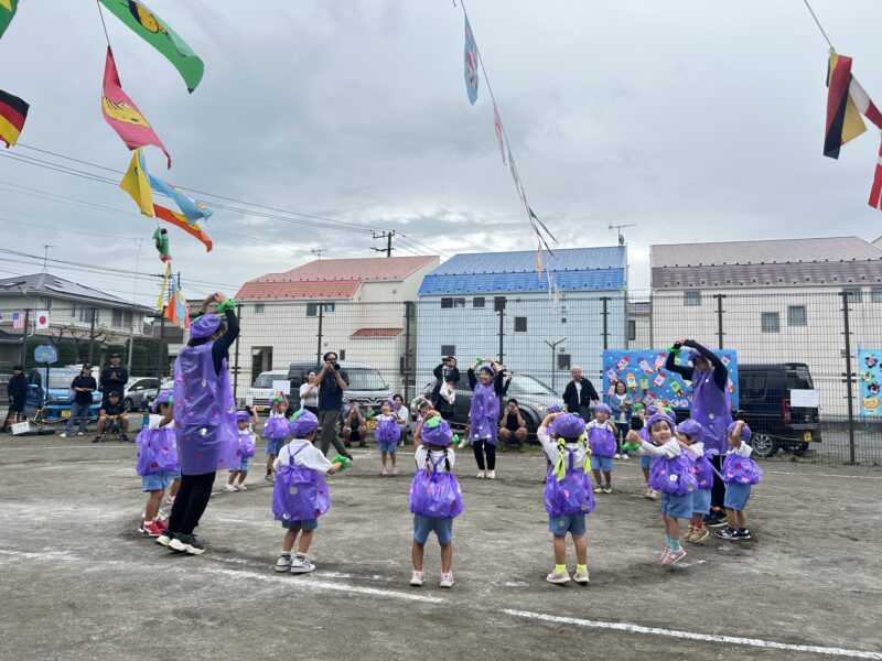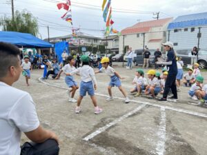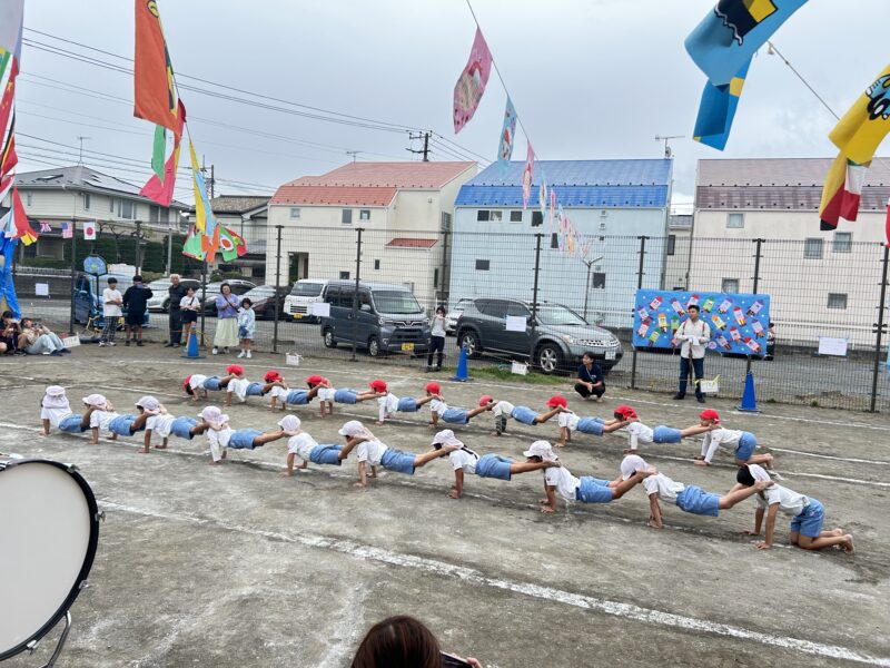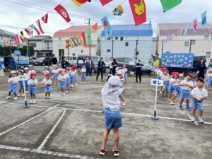 小雨の中 準備開始…決行!子どもたちのてるてる坊主と先生たちの念力で開始直前に雨は止み、終了後に又 雨が降り始めたという今日の運動会でした!みんな少しドキドキ、半分わくわくで、各競技は応援のおうちの方々やお友だち、先生たちの大歓声に包まれていました。小学生の参加も多く、久しぶりに来園してくれた卒園児も楽しんでくれたことと思います。また、コロナ禍以降、何年かぶりに保護者競技の綱引きもプログラムに追加!おとうさん、おかあさん、おじいちゃん、おばあちゃんも本気で引っ張り、迫力満点でした!