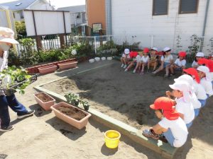 年中組ではプランターにいちごの苗を植えました。