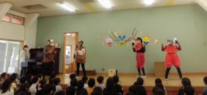 ☘ 対面式 ☘ 全園児がステージのへやに、クラスから自分の椅子を運んで集合しました。おはようのご挨拶の歌を歌い、続いて先生たちからのプレゼント劇「さるとかに(さるかに合戦)」を観ました。先生たちは演技に台詞に一生懸命でしたが、楽屋からステージに登場するたびに子どもたちの席からは笑い声が! 年長さんが牛乳パックを利用して作ったたコマを年少さん年中さんにプレゼントしました。黒部丘幼稚園の仲間たち、これから一緒に仲良く遊びましょう。