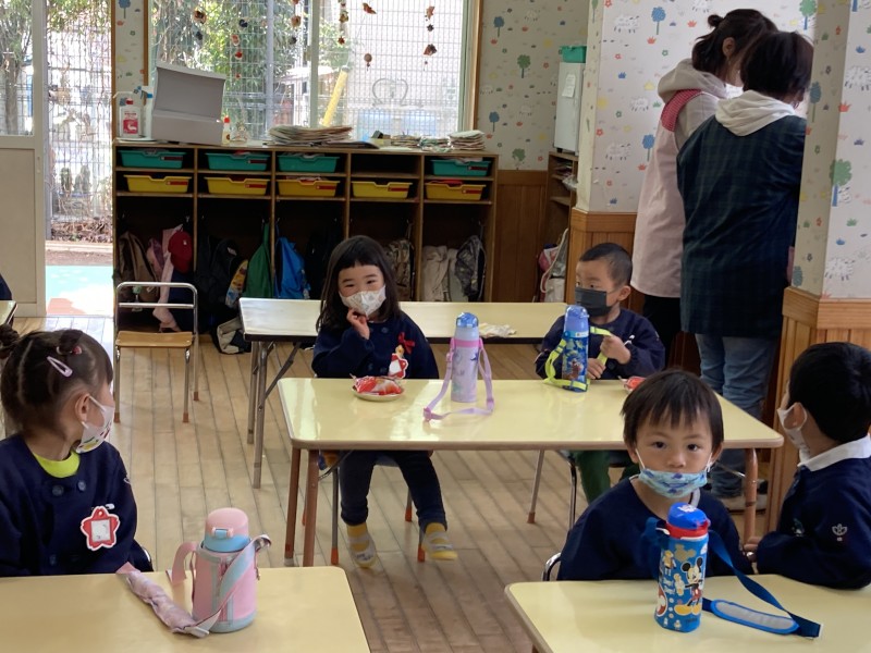 ☘3月のお誕生会☘ 各教室では、お誕生日の人の胸には赤いリボンがつけられて前に出てきてインタビュー🎙 お祝いに先生からのお話プレゼントがあり、皆から ♫たんじょうびおめでとう ○○くん おめでとう~♫の歌の後は、ペコちゃんのほっぺを大きなお口に頬ばっていました! 年長組 年中組 年少組