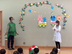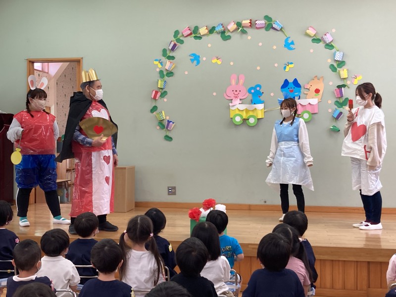 ☘対面式 R4.4.22(金)☘ ステージの部屋に初めて全員集まりました。年長のおにいさんおねえさんが作った楽しい模様入りの風車がプレゼントされました。どうぞよろしく、仲良くしてね! そして、先生たちからの劇のプレゼントは「不思議の国のアリス」。子どもたちは少し あっけにとられて見ている風でした (^_-) ナレーター さちえ先生 アリス ゆう先生 うさぎ あみ先生 青虫 杉崎おじさん トランプマン はるか先生 双子 柏木おじさん・園長先生 ハートの女王 理事長先生 でした!