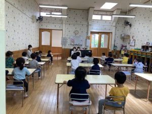☘4月のお誕生会☘ 学年で一番おにいさん、おねえさんの4月生まれのお友だち!先生に、胸に赤いリボンをつけてもらい、前に出てきて、インタビューにもしっかり答えられました。4月生まれの人のいないクラスも「おたんじょうび、おめでとう」の歌で蔭ながらお祝いしました。先生からのお話プレゼントも とても楽しんでいましたよ! この日は暑くて、園服を脱いでいる人がほとんどでした☀