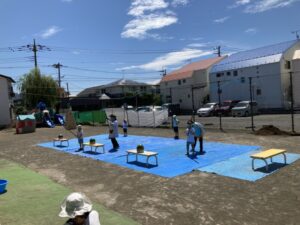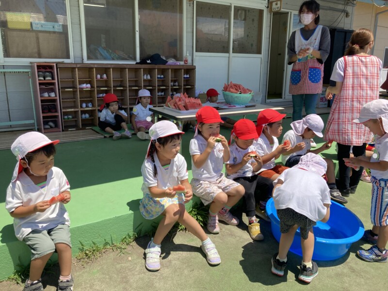 ☘夏期保育☘ 第一日目は、8月生まれの園児を祝う「すいかわり」お誕生会です。応援席からは右だの左だの、そのまままっすすぐ、など歓声で沸き返っていましたが、挑戦中の人はよく聞こえず わからず(?)、とにかく、すいかの方向へ進めるよう勘を働かせて、先生もギラギラ太陽の下 一生懸命でした。いざ、すいかが切られテーブルに並ぶと、「たたくのはいいけれど、食べるのはあんまり…」という人たちが奥に何人か控えていました。また、写真屋さんとは別に、卒園アルバムのため年長役員さんによる撮影がありました。