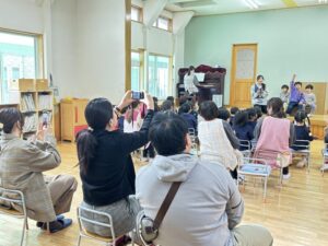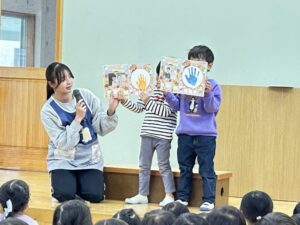 Happy Birthday Dear みなさ~ん ステージの上のお友だちは胸につけた赤いリボンと、カードにペッタンした手型が誇らし気です!おうちの方も手を振って とっても嬉しそうでしたね❣ しおね先生のお話プレゼントも楽しみました!